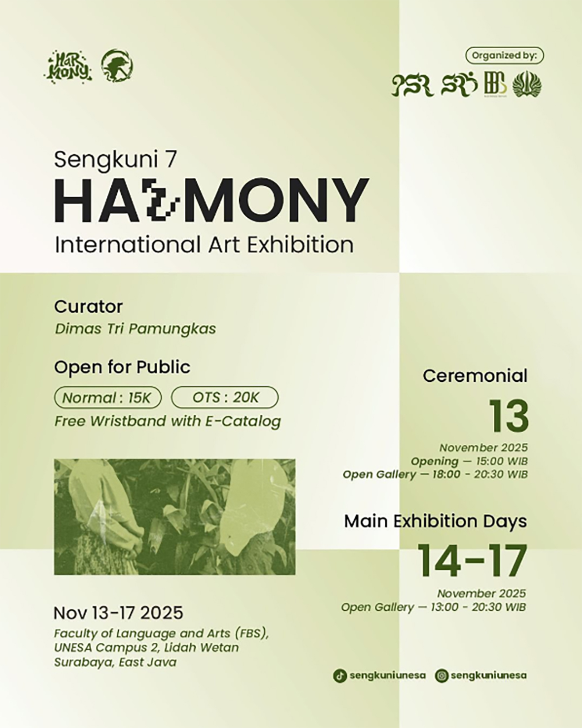 Berangkat dari kesadaran tersebut, Himpunan Mahasiswa Pendidikan Seni Rupa dan Himpunan Mahasiswa Seni Rupa Murni Universitas Negeri Surabaya (UNESA) kembali menyelenggarakan pameran Sengkuni (Serangkaian Ungkapan Karya Seni) yang kini memasuki edisi ke-7. Pada tahun 2025 ini, Sengkuni mengangkat tema “HARMONI”, sebuah tajuk yang tidak hanya dipilih sebagai nama, tetapi sebagai dorongan batin untuk melihat ulang bagaimana manusia menjalani kehidupan bersama di tengah dunia yang penuh ketegangan dan perbedaan.