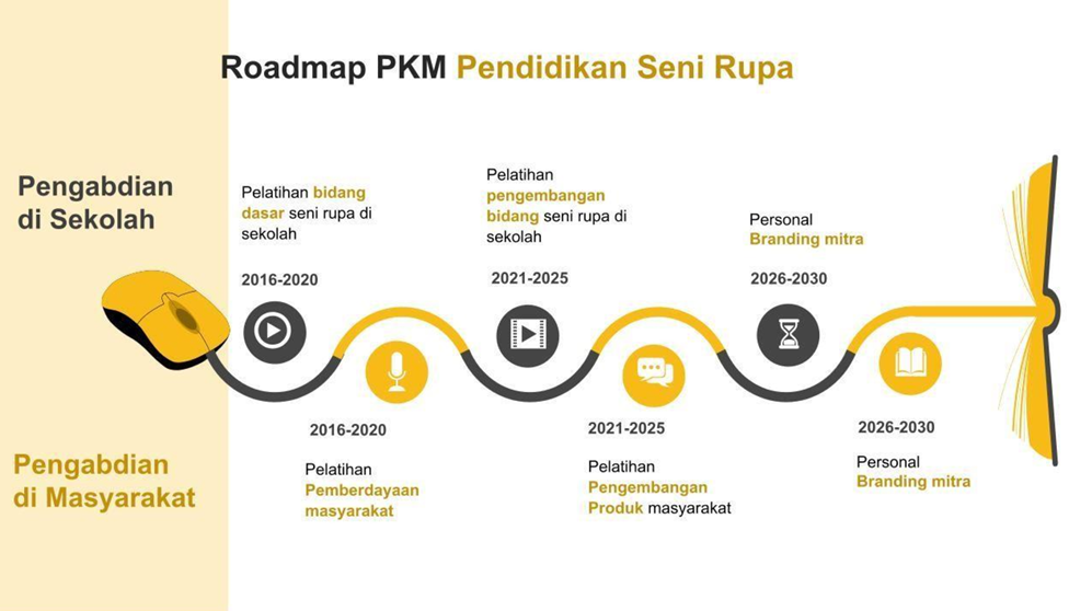 Program Studi Pendidikan Seni Rupa UNESA melaksanakan kegiatan PKM berdasarkan roadmap pengabdian yang telah disusun untuk periode jangka panjang 2016–2030. Roadmap ini dibangun atas dasar pemetaan kebutuhan mitra dan relevansi keilmuan seni rupa dalam konteks pendidikan dan pemberdayaan masyarakat.